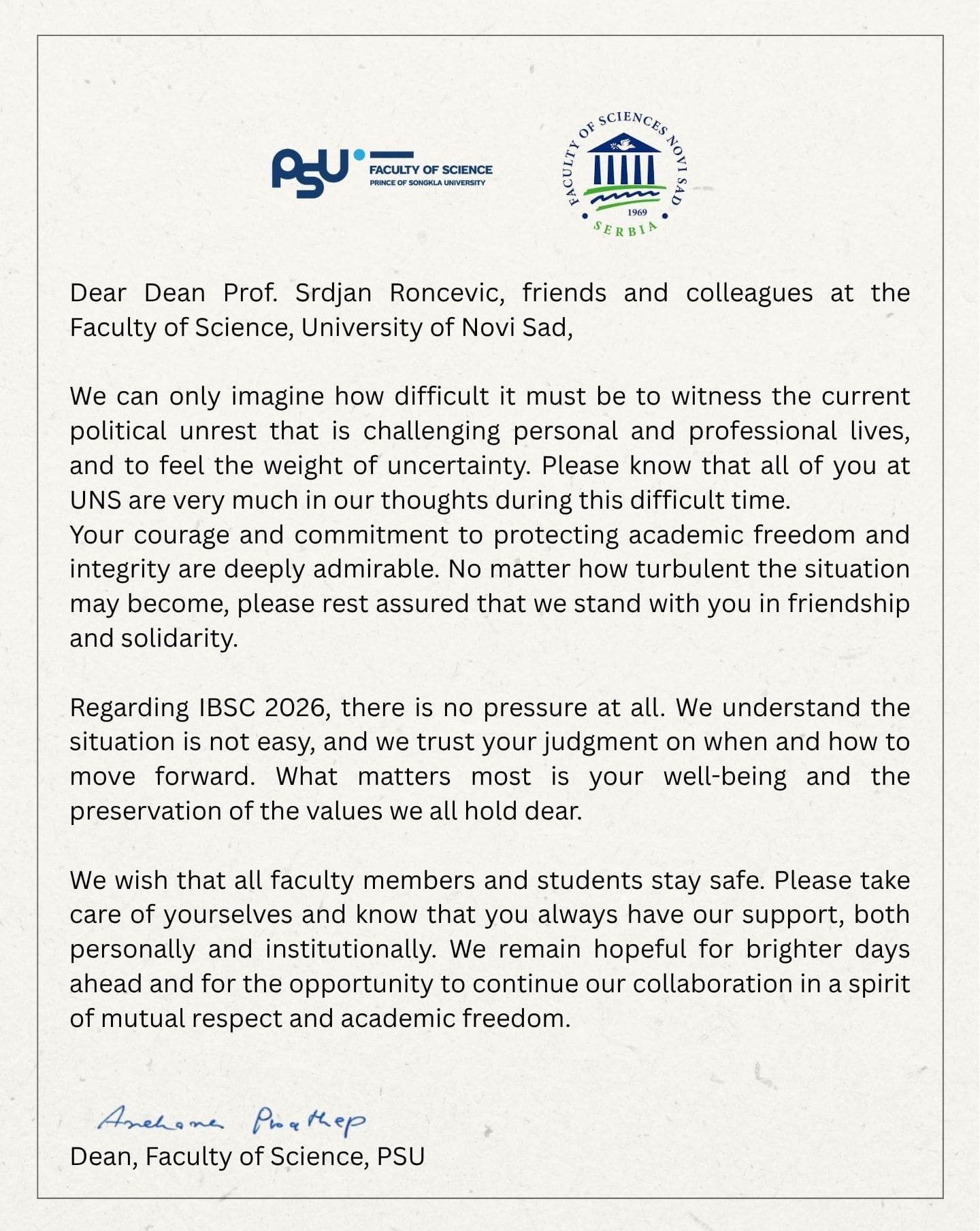 Подршка Природно-математичком факултету и Универзитету у Новом Саду од наших драгих колега и пријатеља са Универзитета Принц од Сонгкле са Тајланда и декана њиховог ПМФ-а, проф др Анчане Пратеп.