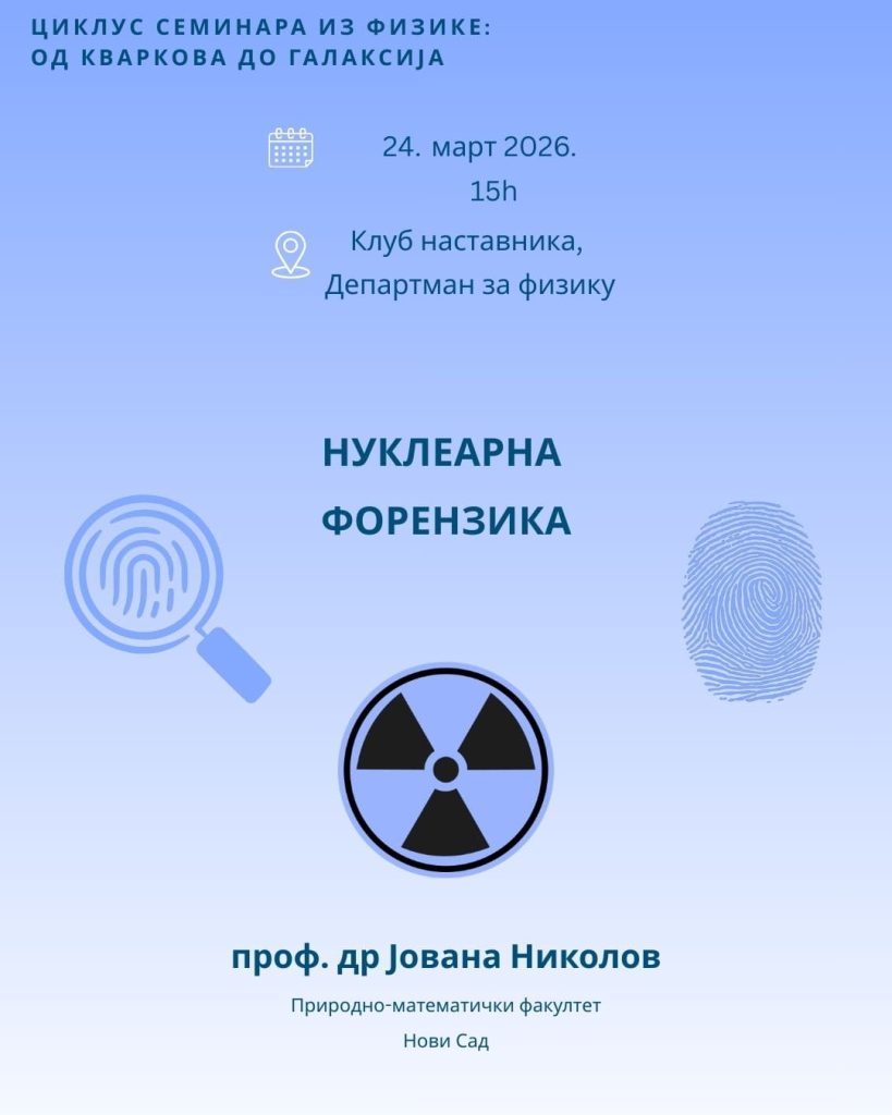 У оквиру циклуса семинара из физике „Од кваркова до галаксија“, у уторак, 24. марта у 15h биће одржано наредно предавање у Клубу наставника (II спрат, ДФ/ДМИ) под насловом „Нуклеарна форензика“.