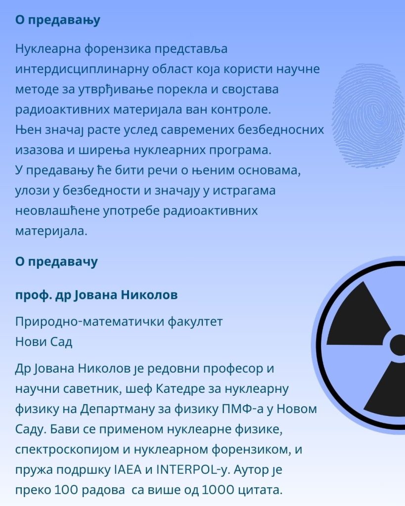 У оквиру овог предавања биће размотрени основни принципи нуклеарне форензике, њен положај у систему нуклеарне безбедности, као и њена улога у подршци криминалистичким истрагама које се односе на неовлашћено поседовање, промет или употребу радиоактивних материјала. Предавање ће такође обухватити одабране примере из међународне праксе, у којима је нуклеарна форензика дала значајан допринос разјашњавању инцидената и одређивању могућег порекла заплењеног или пронађеног материјала. С тим у вези, биће истакнут безбедносни и институционални значај нуклеарне форензике као једног од кључних инструмената савременог одговора на нуклеарне и радиолошке претње.