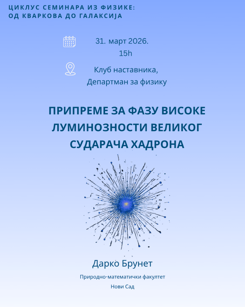У оквиру циклуса семинара из физике „Од кваркова до галаксија“, у уторак 31. марта у 15 h се одржава предавање „Припрема за фазу високе луминозности великог сударача хадрона“, предавач је Дарко Брунет, асистент на Природно-математичком факултету у Новом Саду и студент докторских студија Физичког факултета у Београду.
