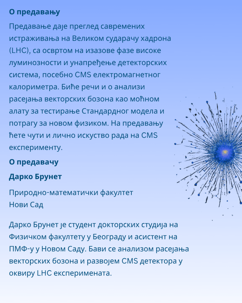 На предавању ћете имати прилику да чујете и лично искуство са рада на унапређењу детекторских система, са посебним освртом на развој електромагнетног калориметра CMS детектора.