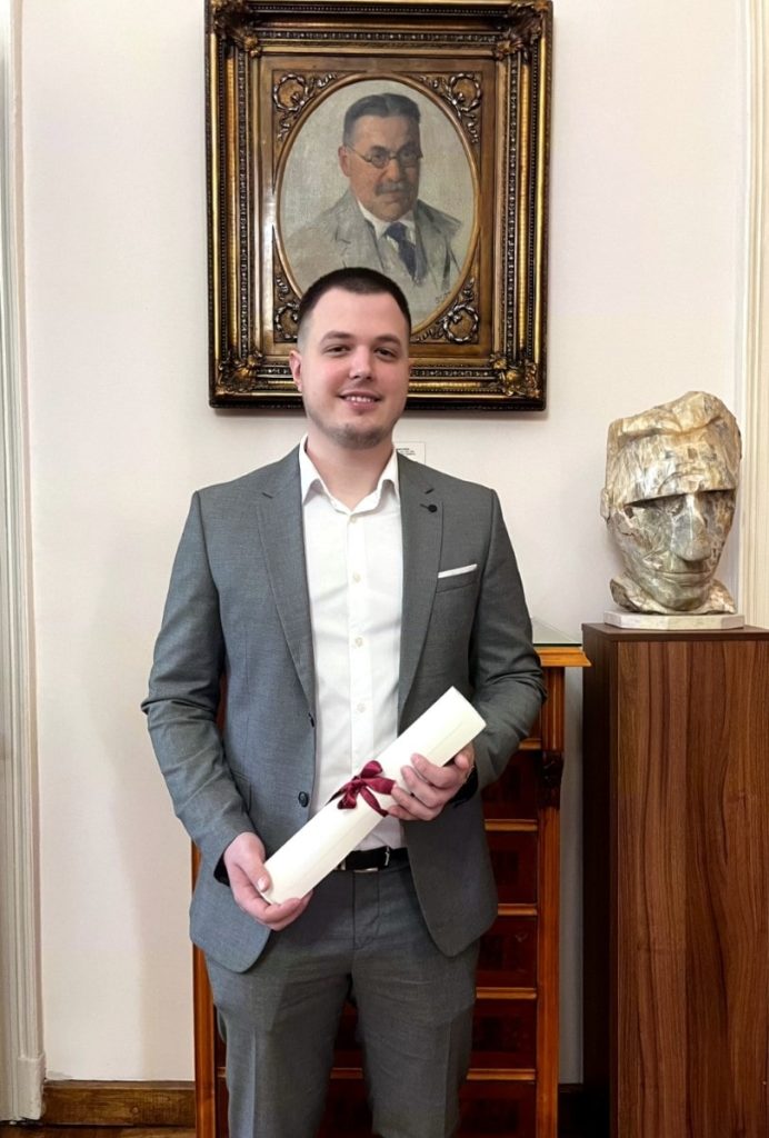 Другу награду добио је Слађан Јелић, тренутно асистент-мастер на Факултету техничких наука, за мастер рад одбрањен на нашем Департману за физику под називом „Простирање таласа у вискоеластичном материјалу фракционог Бургерсовог типа“, који је урађен под менторством др Душана Зорице и др Жељке Цвејић.